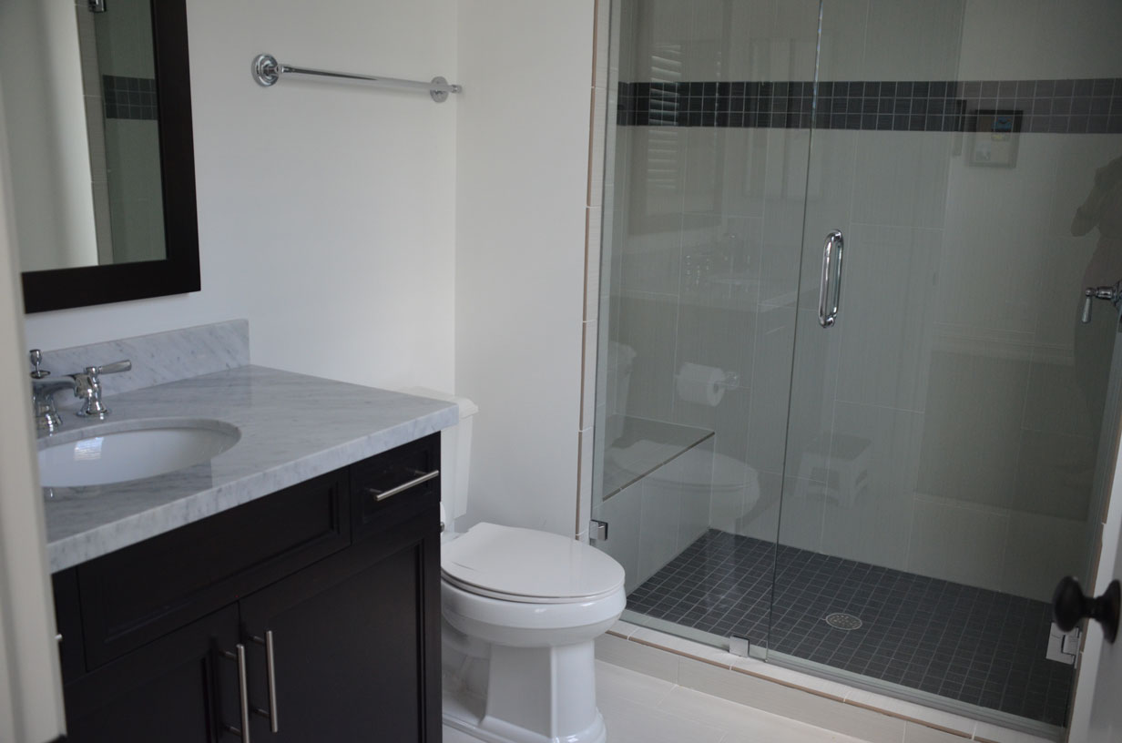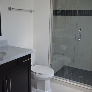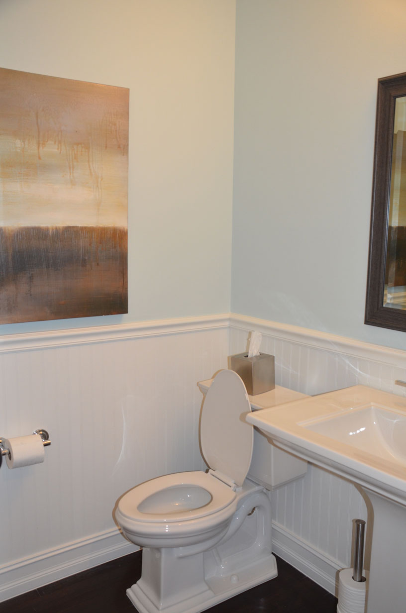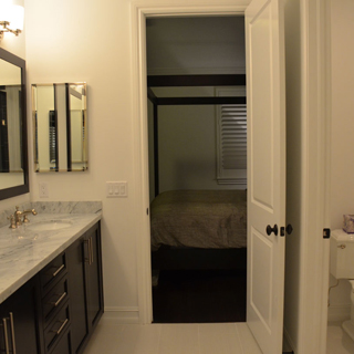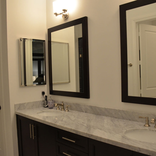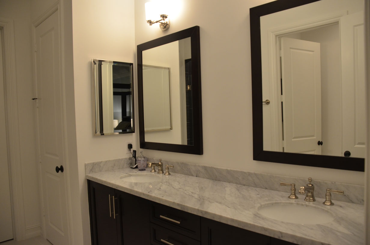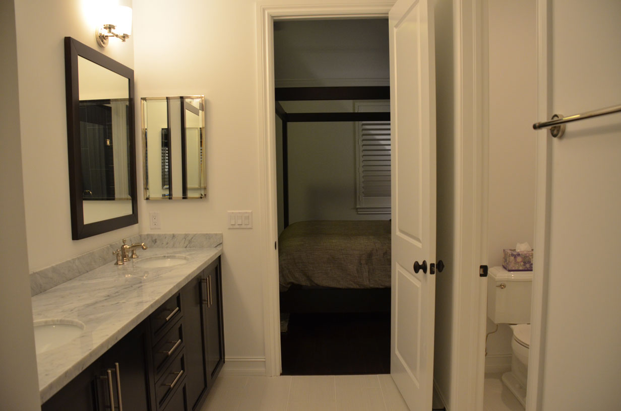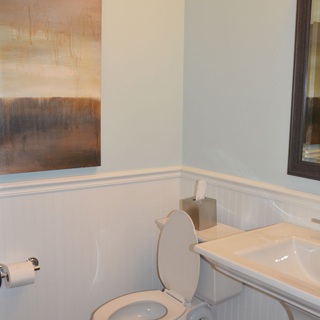 (Toilette dans une petite salle fermée, comptoir avec 2 lavabos et cabinets)